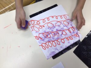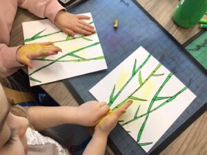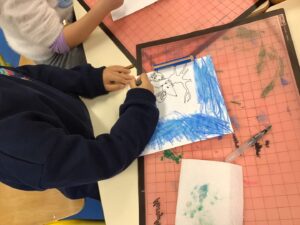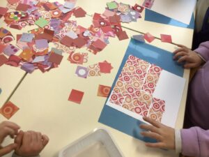 Il a fallu écouter et comprendre l’histoire, créer les illustations en utilisant différentes techniques d’arts plastiques, colorier les personnages, remettre les pages dans l’ordre, s’entrainer à raconter l’histoire en essayant de réutiliser des tournures de phrases, des mots de vocabulaire particulier (dare dare, socquettes, loup des villes, gâteau de fête…), écrire en dictée à l’adulte le texte….