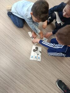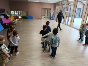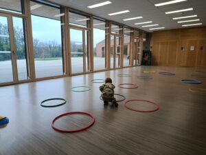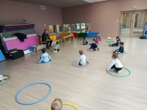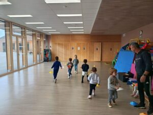 Tous les vendredis matins de la période 2, les deux classes de PS MS se rendent en demi groupe dans la salle de motricité avec David pour des petits jeux d’orientation.